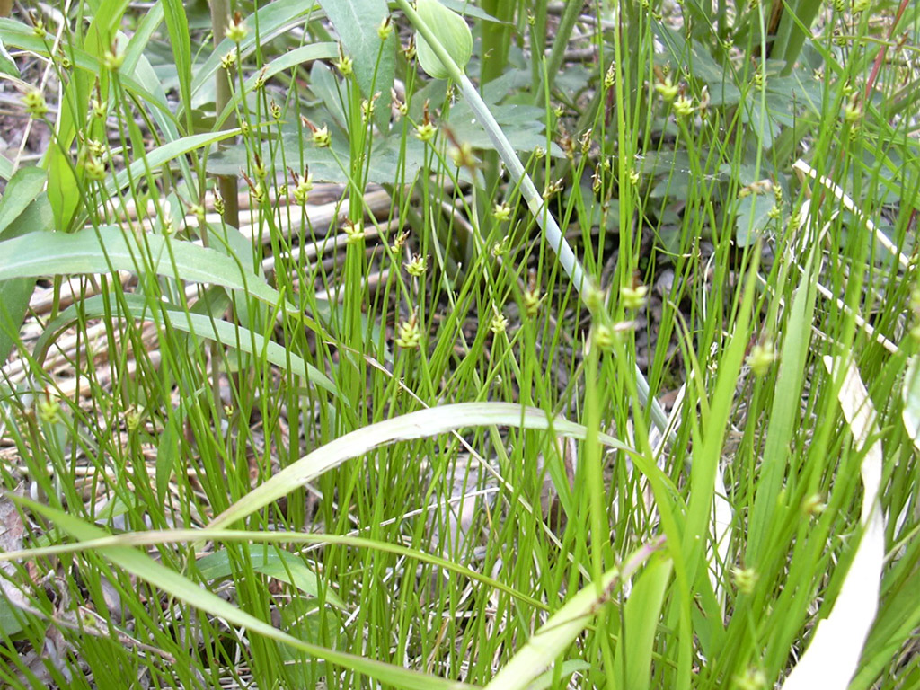 まだ小さいのでどれかわかりません。カヤツリグサ科っぽい気はするのですが・・・ |